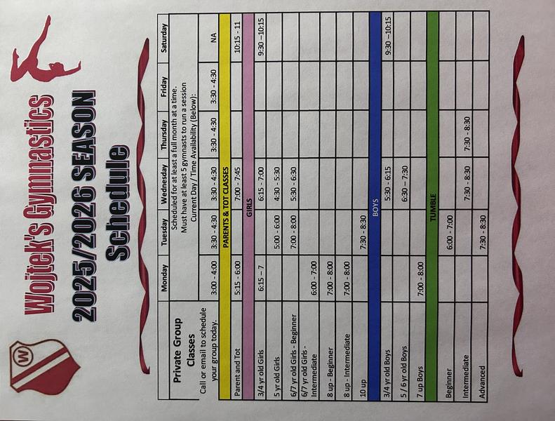 (We only accept cash or checks payable to Wojtek's Gymnastics)